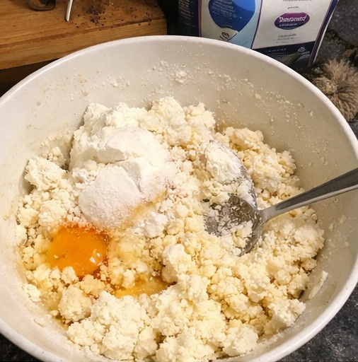 - W misce połącz twaróg, jajka, cukier i cukier wanilinowy. Dokładnie wymieszaj widelcem lub łyżką.