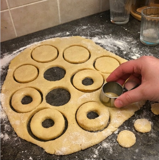 4. Rozwałkuj ciasto na grubość ok. 1–1,5 cm. Szklanką wycinaj krążki, a mniejszą foremką zrób dziurkę w środku.