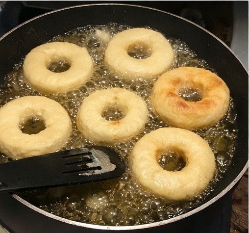 5. Rozgrzej olej (średnia moc). Smaż oponki partiami, po ok. 1–2 minuty z każdej strony, aż będą złociste.