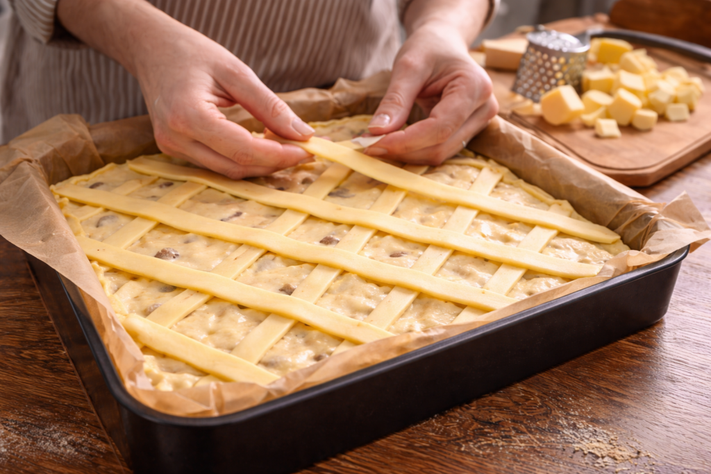 Pozostałą część schłodzonego ciasta rozwałkuj, pokrój w paski i ułóż z nich kratkę na wierzchu. Posmaruj ją roztrzepanym żółtkiem.